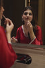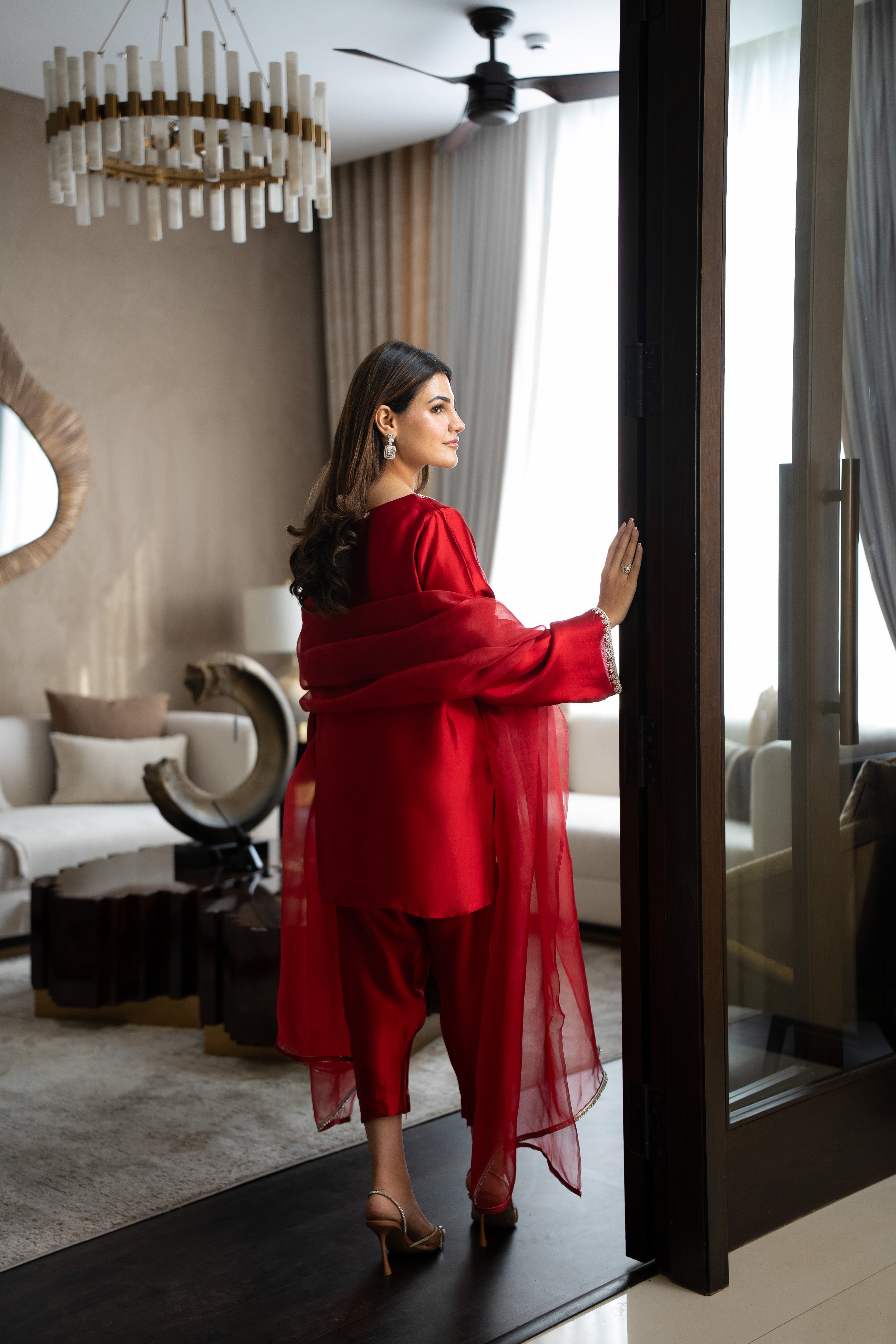Roohi makes a bold statement of festive elegance in radiant red sheesha silk. This short-silhouette shirt features a meticulously hand-worked neckline, sleeves, and hem, intricately adorned with traditional cutdana, dabka, sitara, and baitke embellishments. Enhanced with delicate organza detailing on the hem, the ensemble is paired with a matching skinny shalwar and a pure organza dupatta for a look that is both modern and quintessentially celebratory.