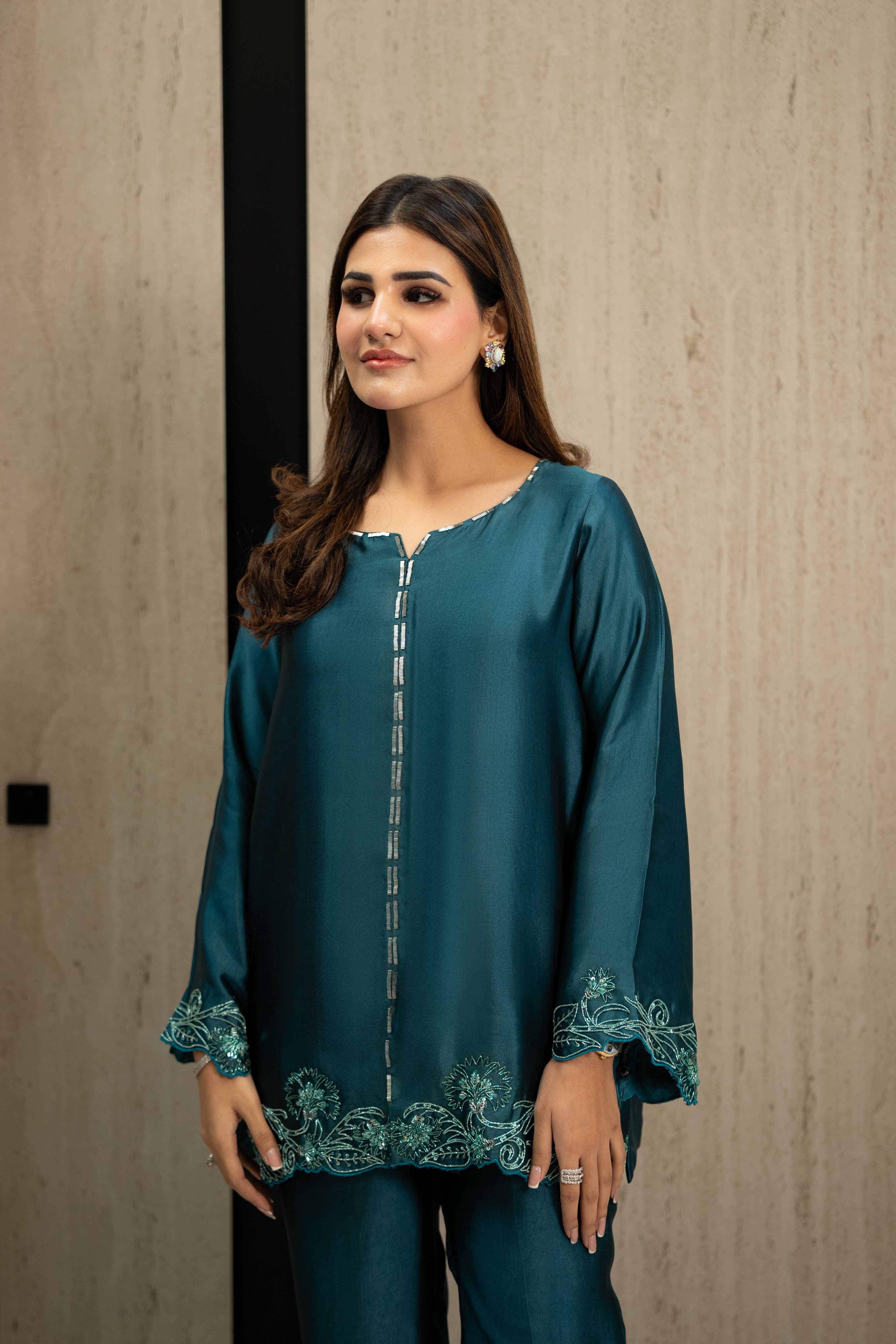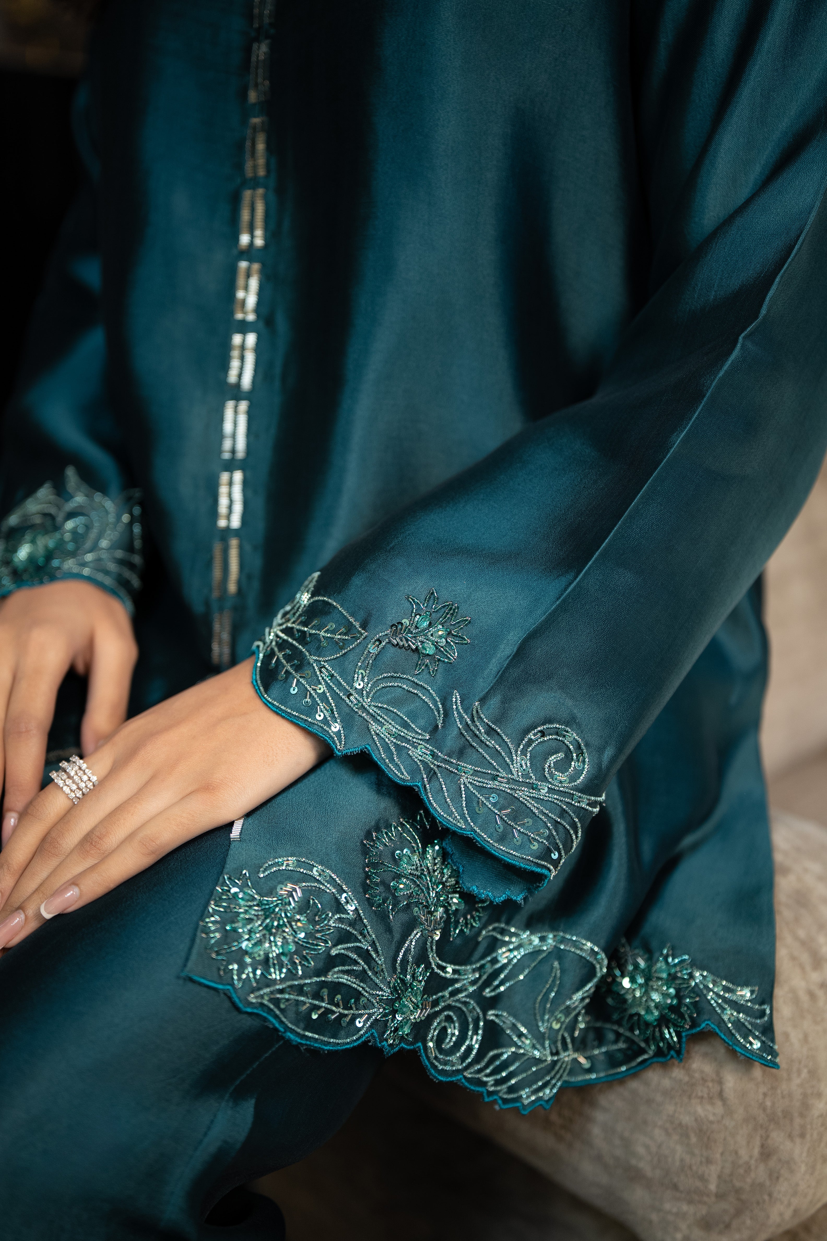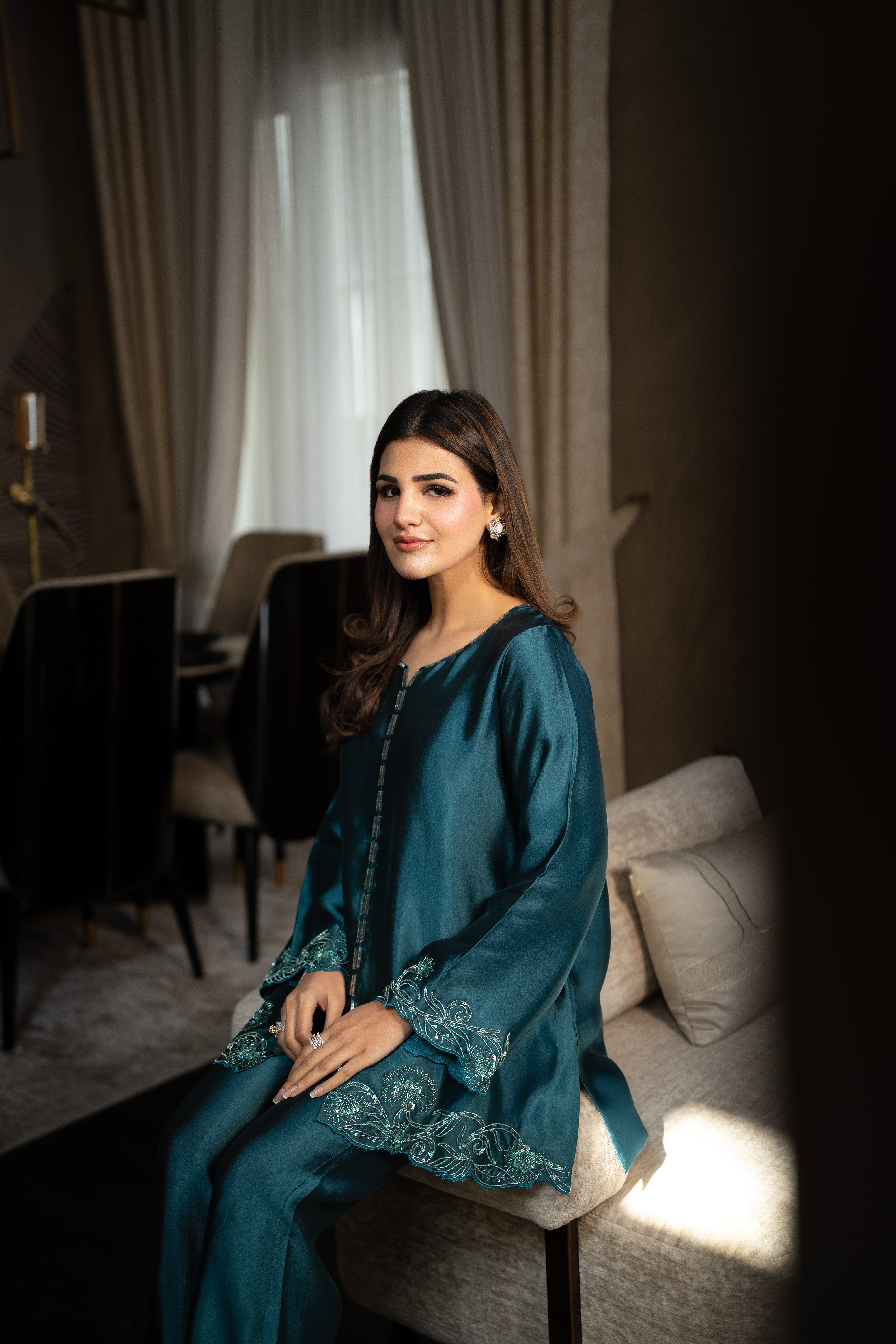 Myra embodies modern sophistication with its striking teal sheesha silk and detailed tonal hand-embroidery. This short-silhouette shirt is intricately crafted with a blend of dabka, naqshi, cutdana, and sitara, accented by the subtle shimmer of sequence and baitke work. With its clean lines and contemporary silhouette, this ensemble is paired with sleek matching pants, making it a standout choice for a refined and stylish Eid.