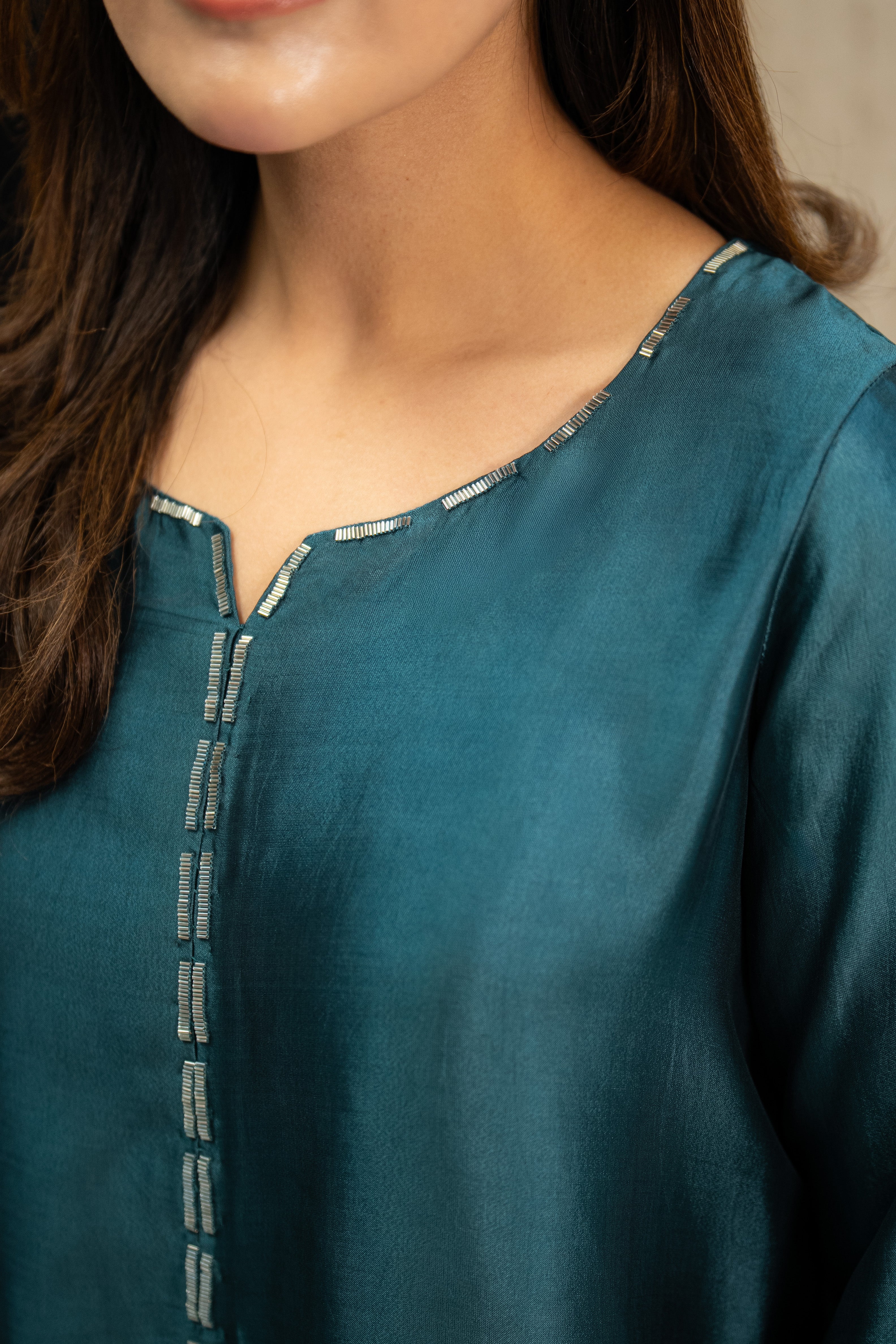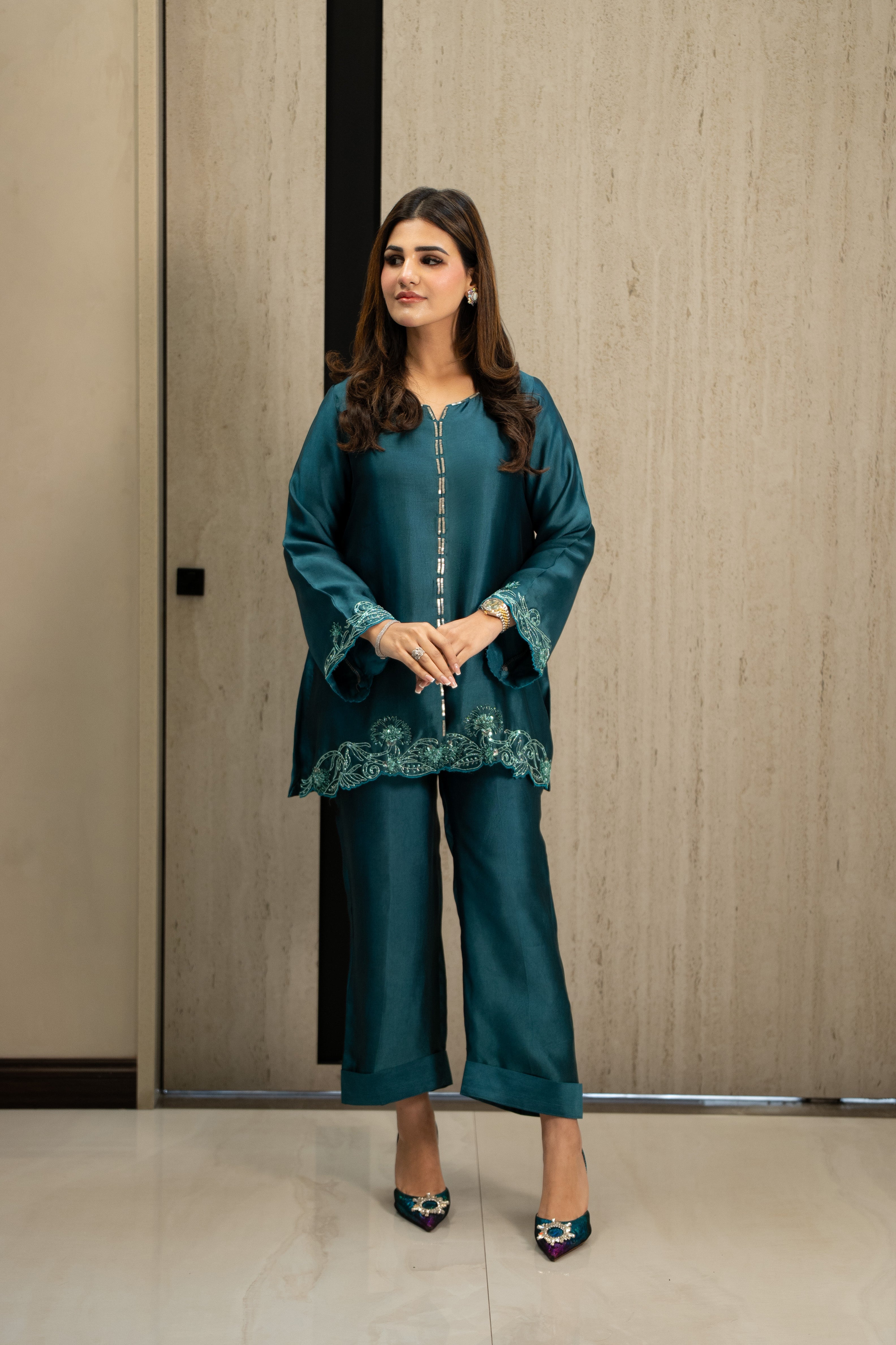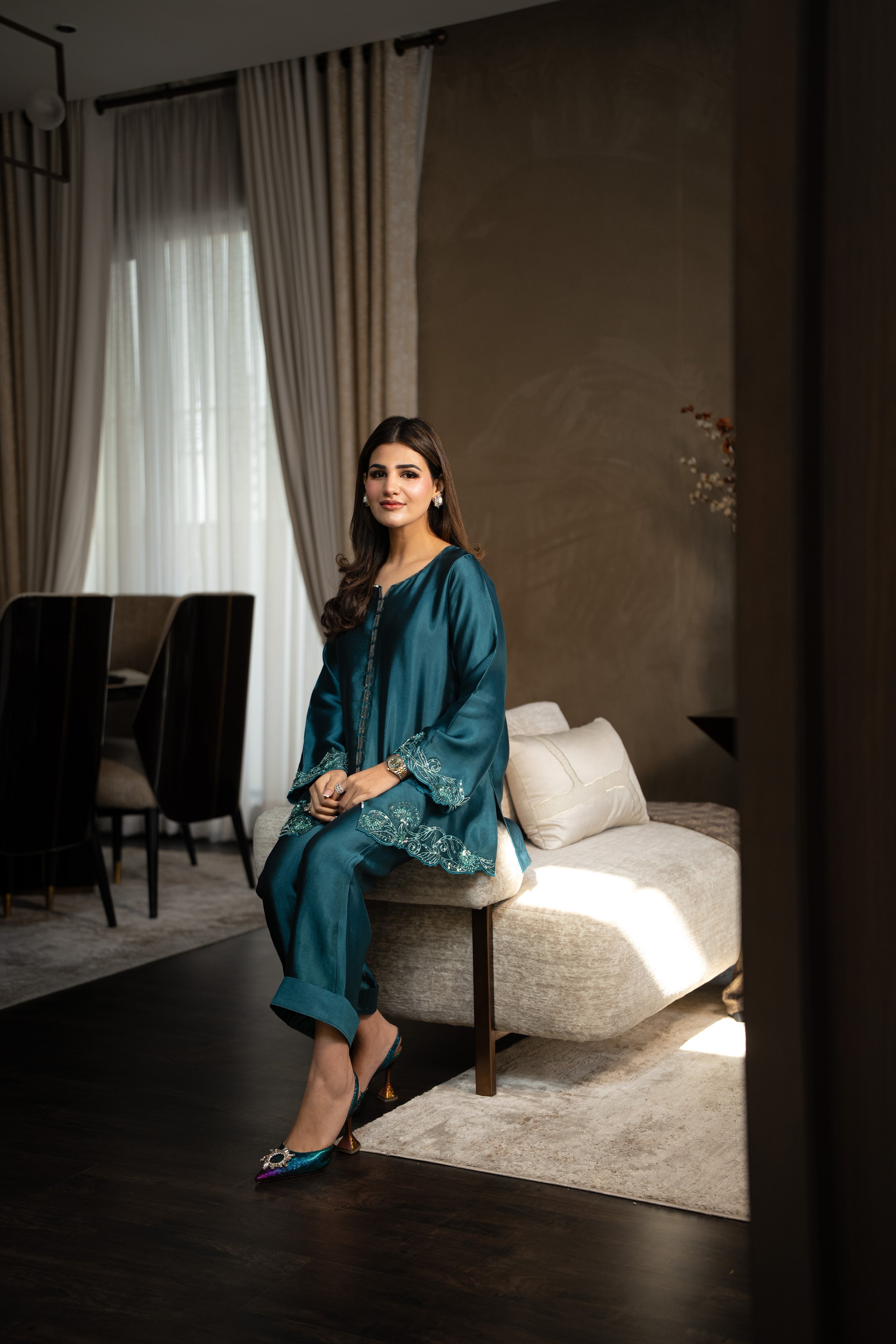 Myra embodies modern sophistication with its striking teal sheesha silk and detailed tonal hand-embroidery. This short-silhouette shirt is intricately crafted with a blend of dabka, naqshi, cutdana, and sitara, accented by the subtle shimmer of sequence and baitke work. With its clean lines and contemporary silhouette, this ensemble is paired with sleek matching pants, making it a standout choice for a refined and stylish Eid.