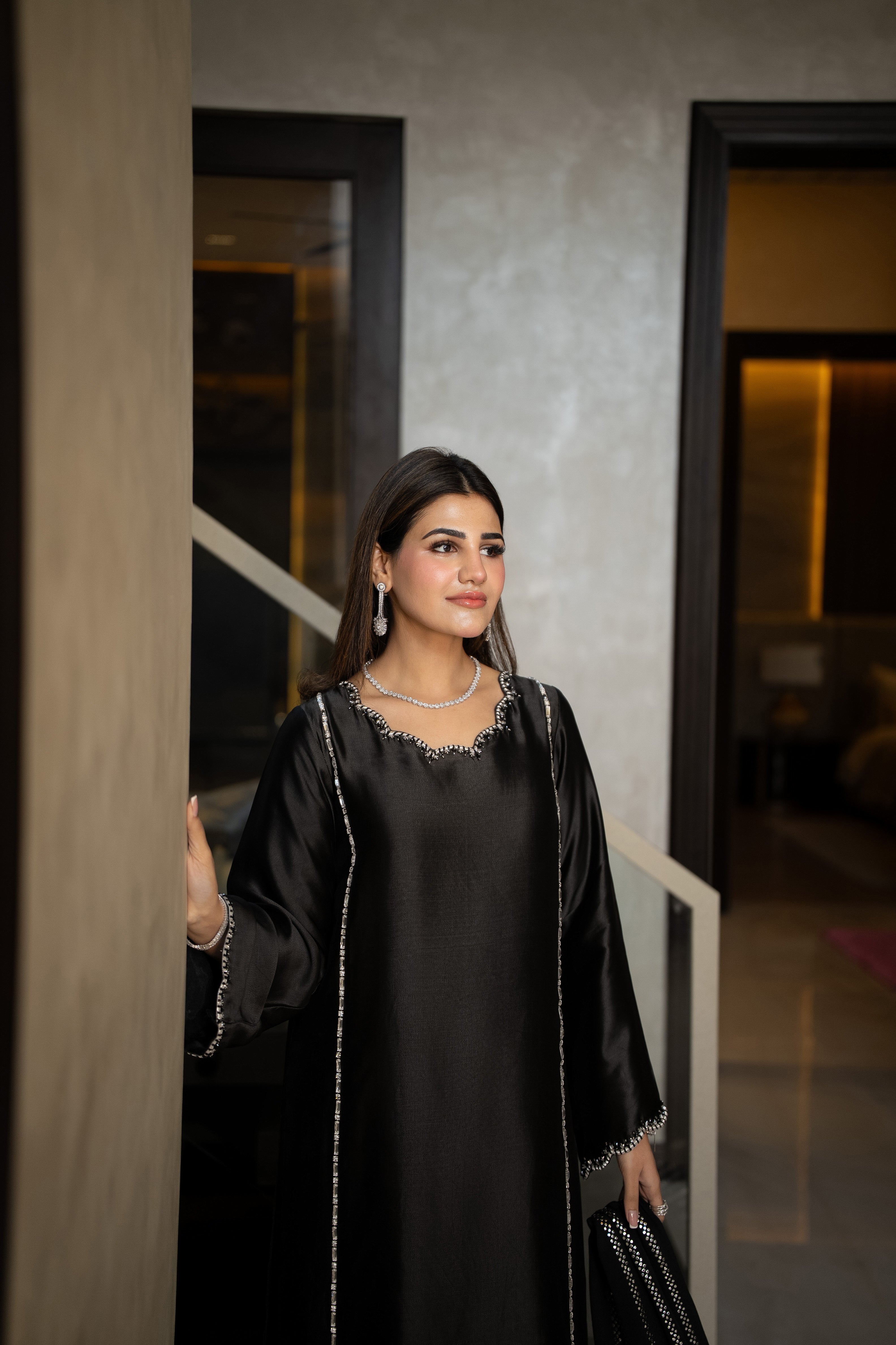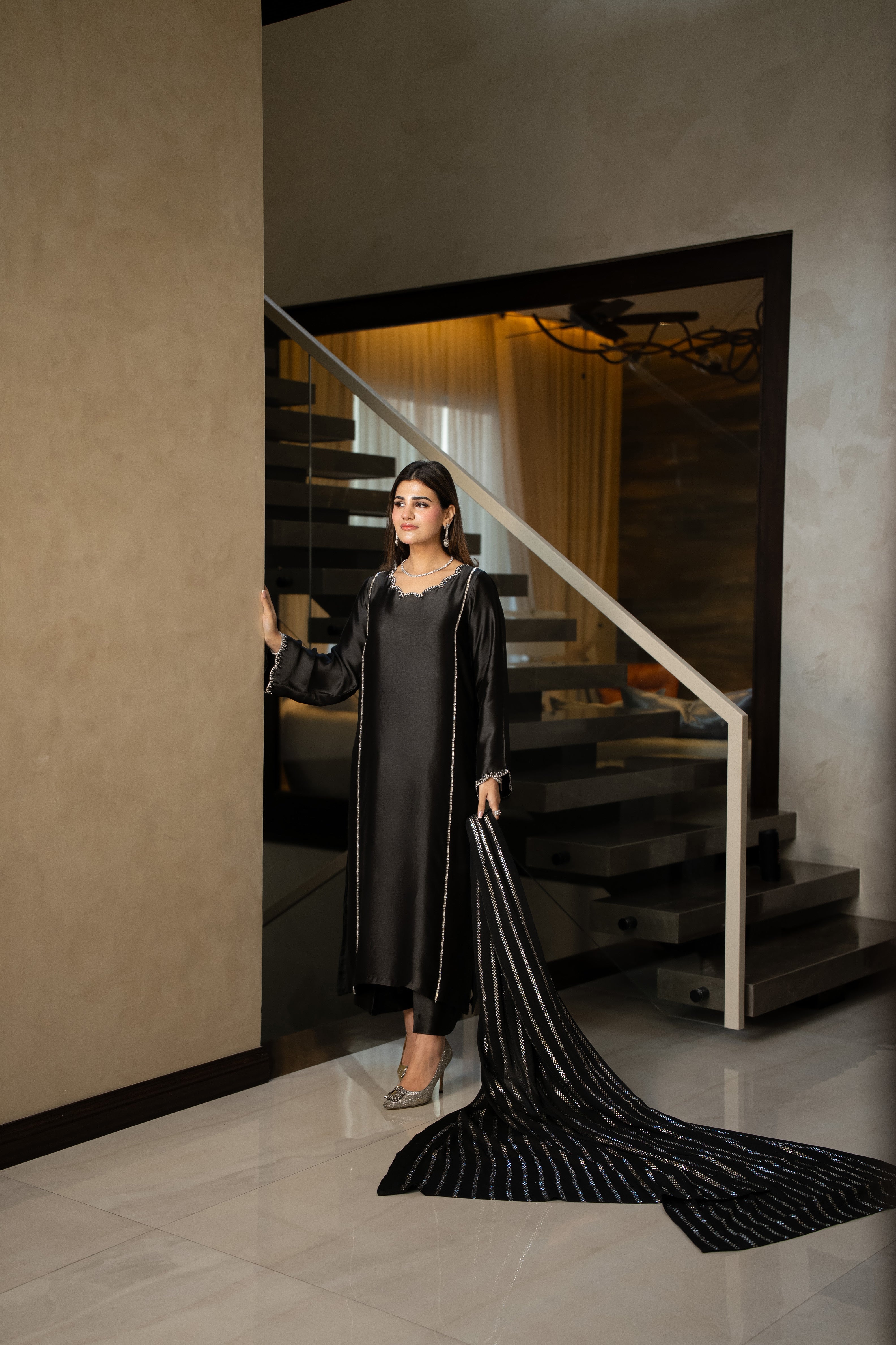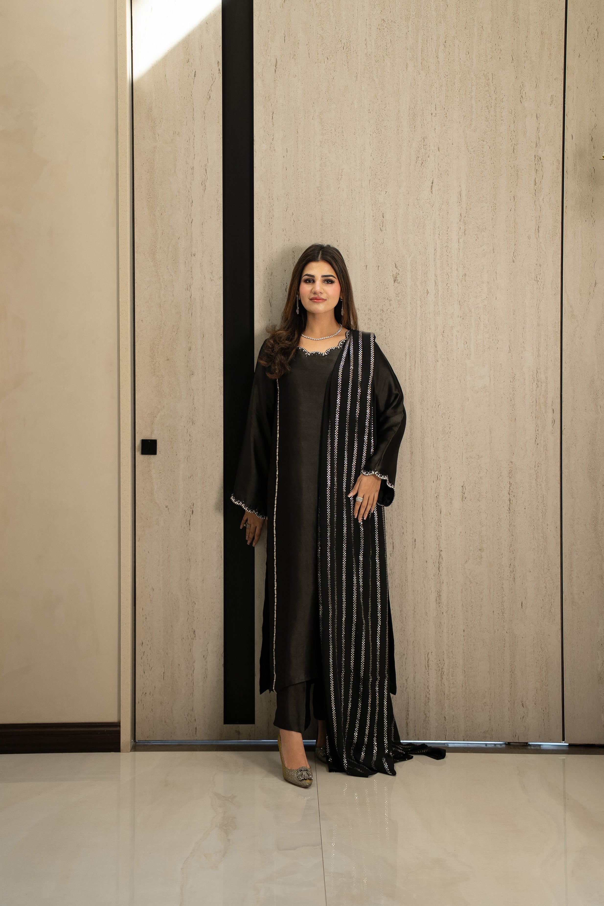 Zimal defines timeless sophistication with its classic long silhouette in midnight black sheesha silk. The ensemble features an intricately hand-worked neckline and sleeves adorned with elegant scalloped detailing and refined stone-line embellishments. Paired with a structured azaar and a heavy, traditional mukesh chadar, this outfit is a masterful blend of vintage craft and modern luxury, designed to make a regal statement this Eid.