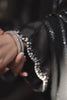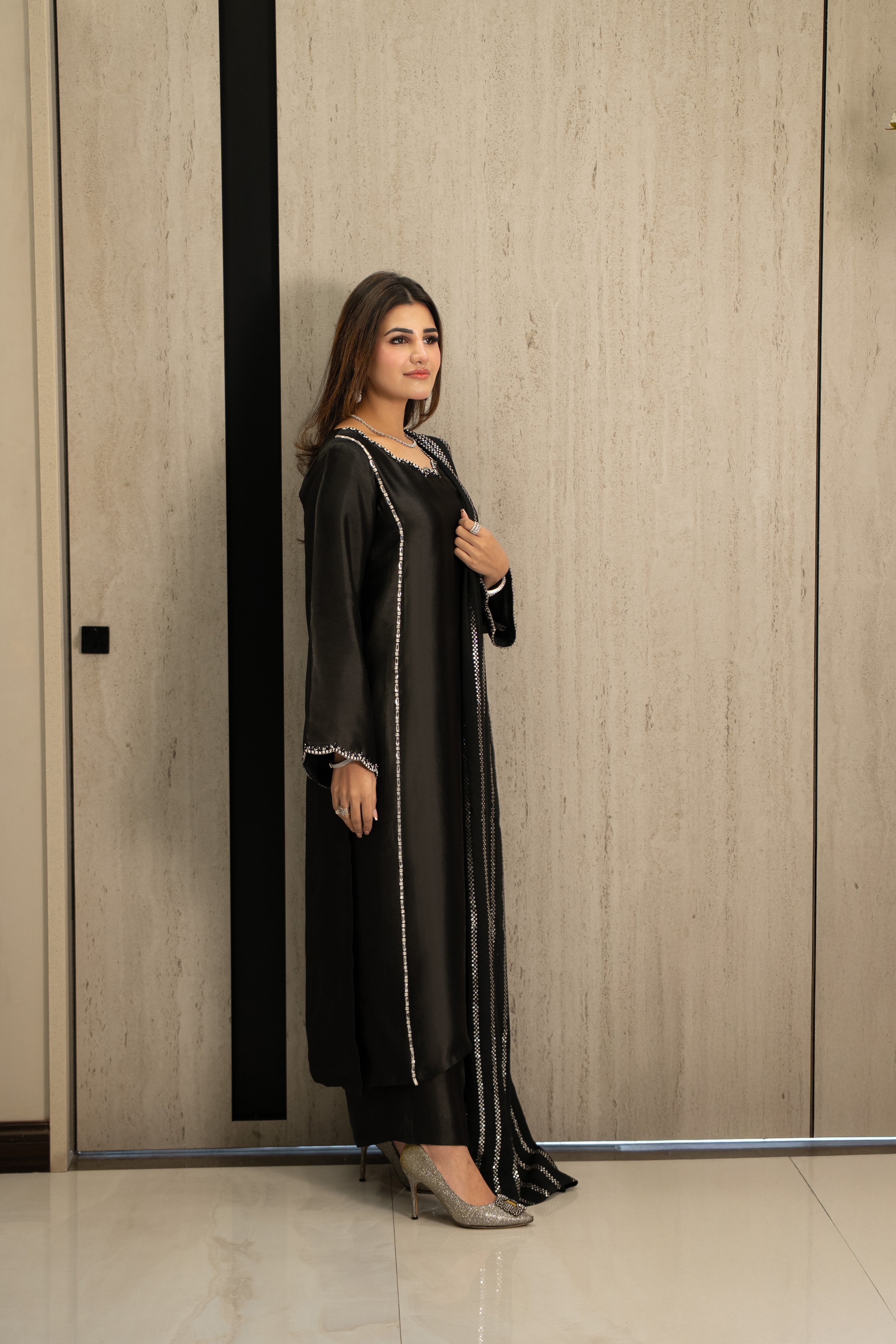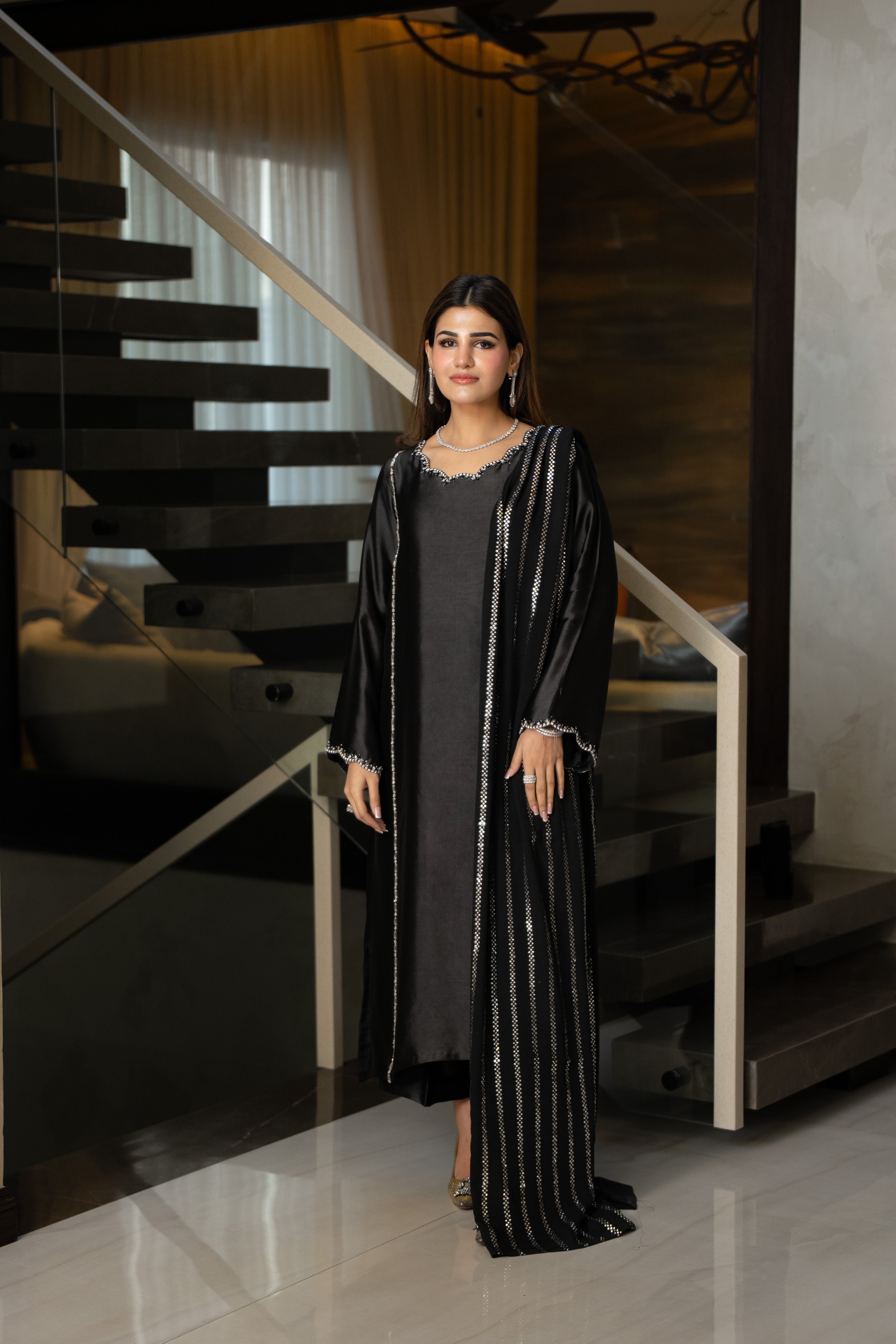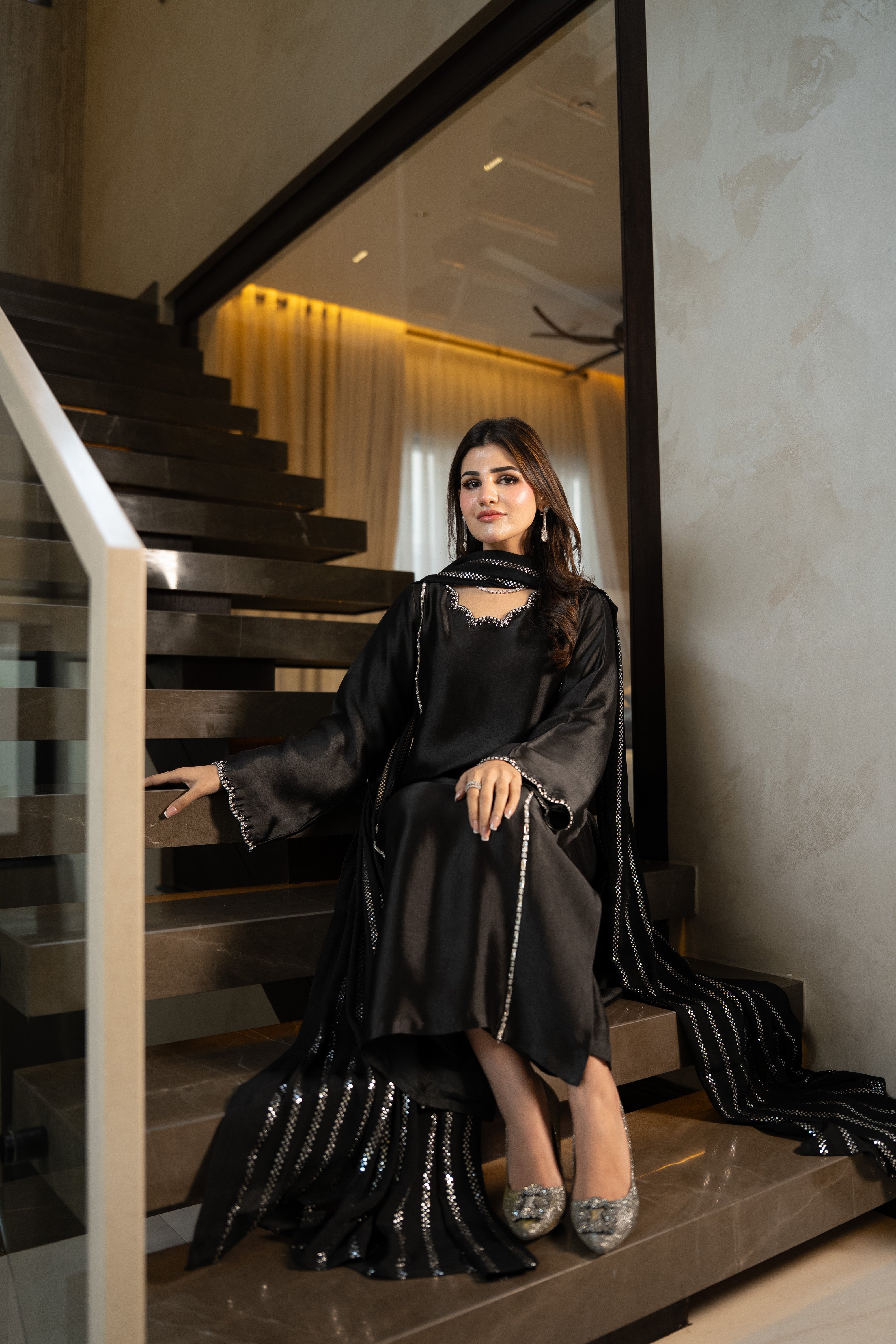 Zimal defines timeless sophistication with its classic long silhouette in midnight black sheesha silk. The ensemble features an intricately hand-worked neckline and sleeves adorned with elegant scalloped detailing and refined stone-line embellishments. Paired with a structured azaar and a heavy, traditional mukesh chadar, this outfit is a masterful blend of vintage craft and modern luxury, designed to make a regal statement this Eid.